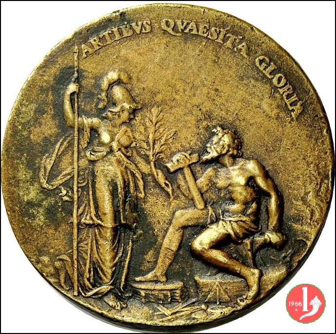 Jacopo da Trezzo 1572 Dritto: IACOBVS NIZOLLA DE TRIZZIA MDLXXII = AN. AB. Busto a dx con mantello Minerva paludata e in piedi volta a dx con elmo e lancia, porge un ramoscello a Vulcano seduto di fronte | |
