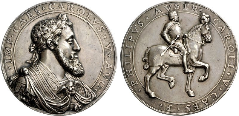 Filippo II e Isabella di Spagna Dritto: PHILIPPVS • II • HISPAN • ET NOVI ORBIS OCCIDVI REX • busto corazzato a sx, con mantello sotto: I • PAVL • POG • F. busto a dx con abito ricamato, collana con pendente e capelli raccolti da trecce e perle sotto: I • PAVL • POG • F • | |