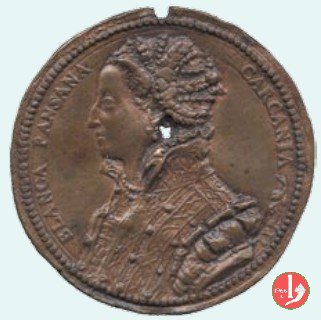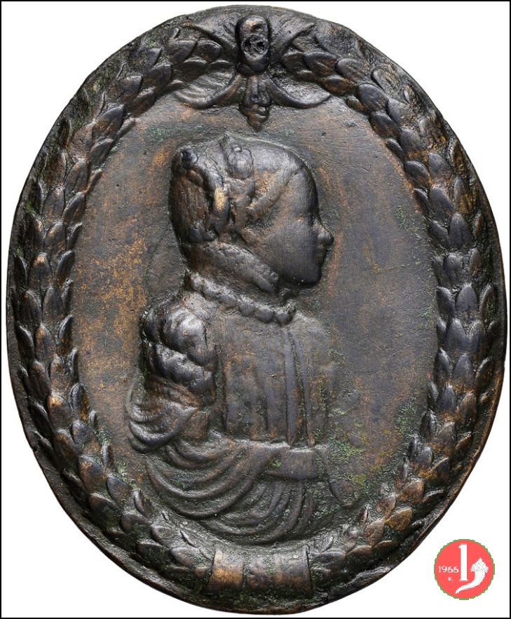 Maria d'Aragona Dritto: entro ghirlanda d'alloro fermata superiormente da nastro: busto a dx con capelli raccolti sulla nuca, mantellina ed abito drappeggiato Verso: tra due sirene alate con fregio in alto: Stemma d'Aragona | |
