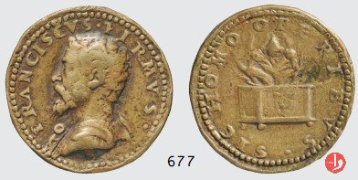 Francesco Taverna 1554 Dritto: FRA • TABERNA • CO • LANDR • MAGN • CANC •STA • MEDIO • AN • LXVI busto a dx con mantello e camicia nel campo a dx: P • P • R cane seduto su base e volto a sx, guarda in cielo il segno zodiacale del capricorno; sullo sfondo paesaggio con obelisco e colonnato dorico | |