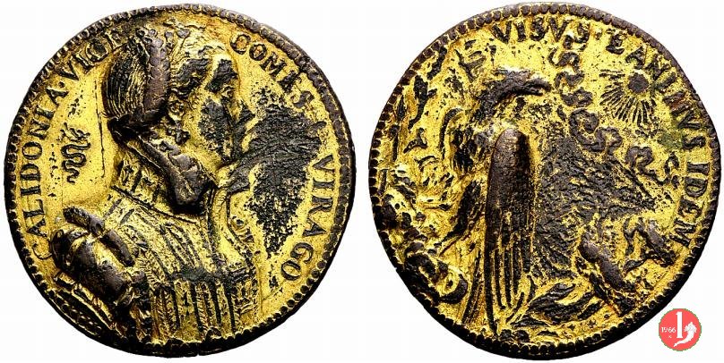 Celidonia Visconti -VT504 Dritto: CALIDONIA • VICE _ COMES • VIRAGO busto a dx con abito ricamato e capelli raccolti da trecce e filo di perle Aquila su cumulo d' armi rivolta al sole | |