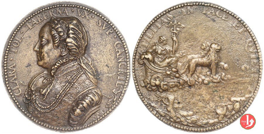 Chiara Tolentini Taverna Dritto: CLARA • TOL • TABERNA • VX • SVP • CANCEIL busto a sx con capelli raccolti da velo, collana a due fili di perle e abito ricamato in basso a dx: P • P • R • Cibele con caduceo, seduta su biga trainata da due leoni verso dx su nubi; in basso paesaggio con albero e rocce | |