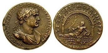 Traiano (98-117) Optimo Principi -L45 Dritto: IMP CAES ' NERVAE TRAIANO AVG GER DAC P M TR P COS V P P busto laureato a dx con mantello fontana con figura maschile distesa verso sx, entro arco sotto: AQ _ VA = TRAIANA in basso, ai lati: S _ C | |