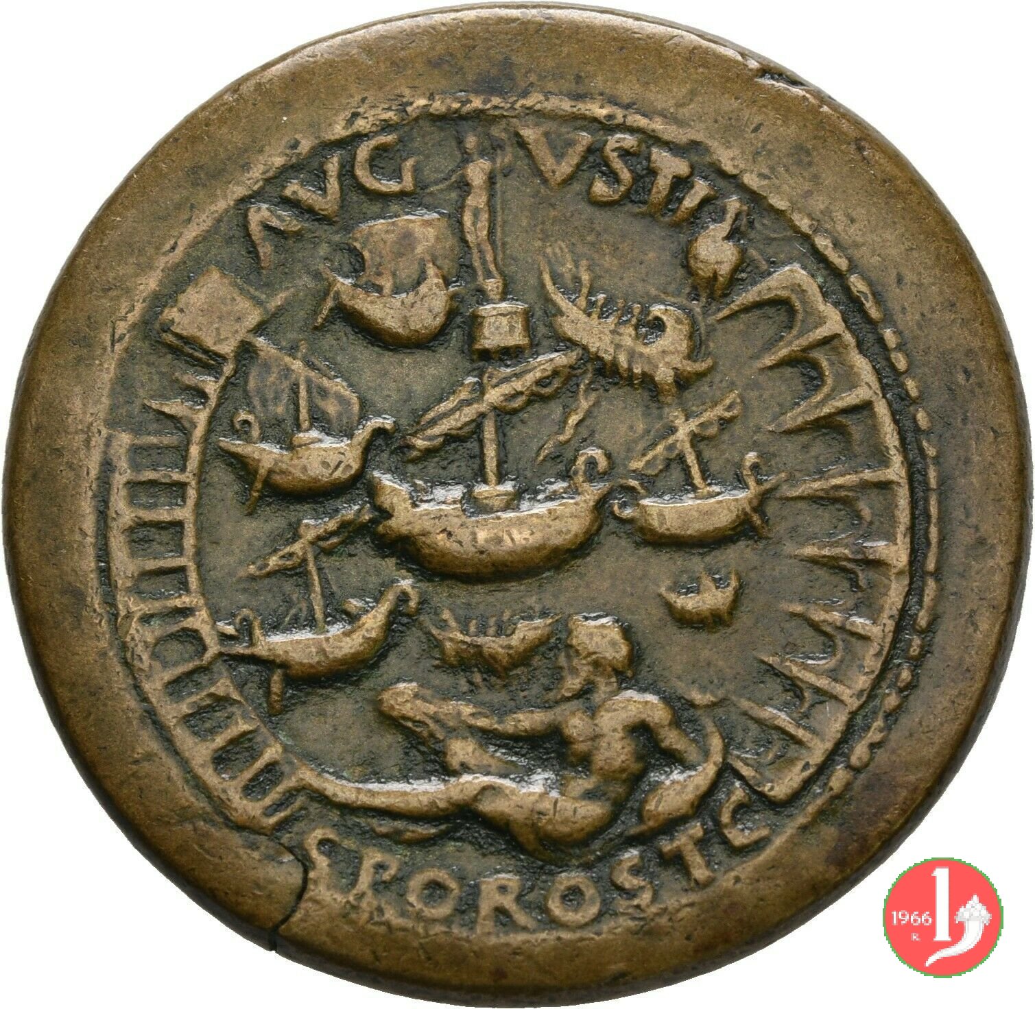 Nerone (54-68 dc) -Battaglia navale -L18 Dritto: NERO CLAVD CESAR AVG G _ ER PR TM P IMP testa laureata a dx Il Porto di Ostia con battaglia navale e figura allegorica (Tevere) distesa verso sx, regge remo e delfino | |