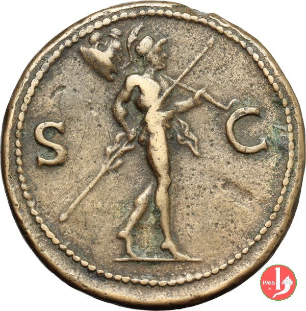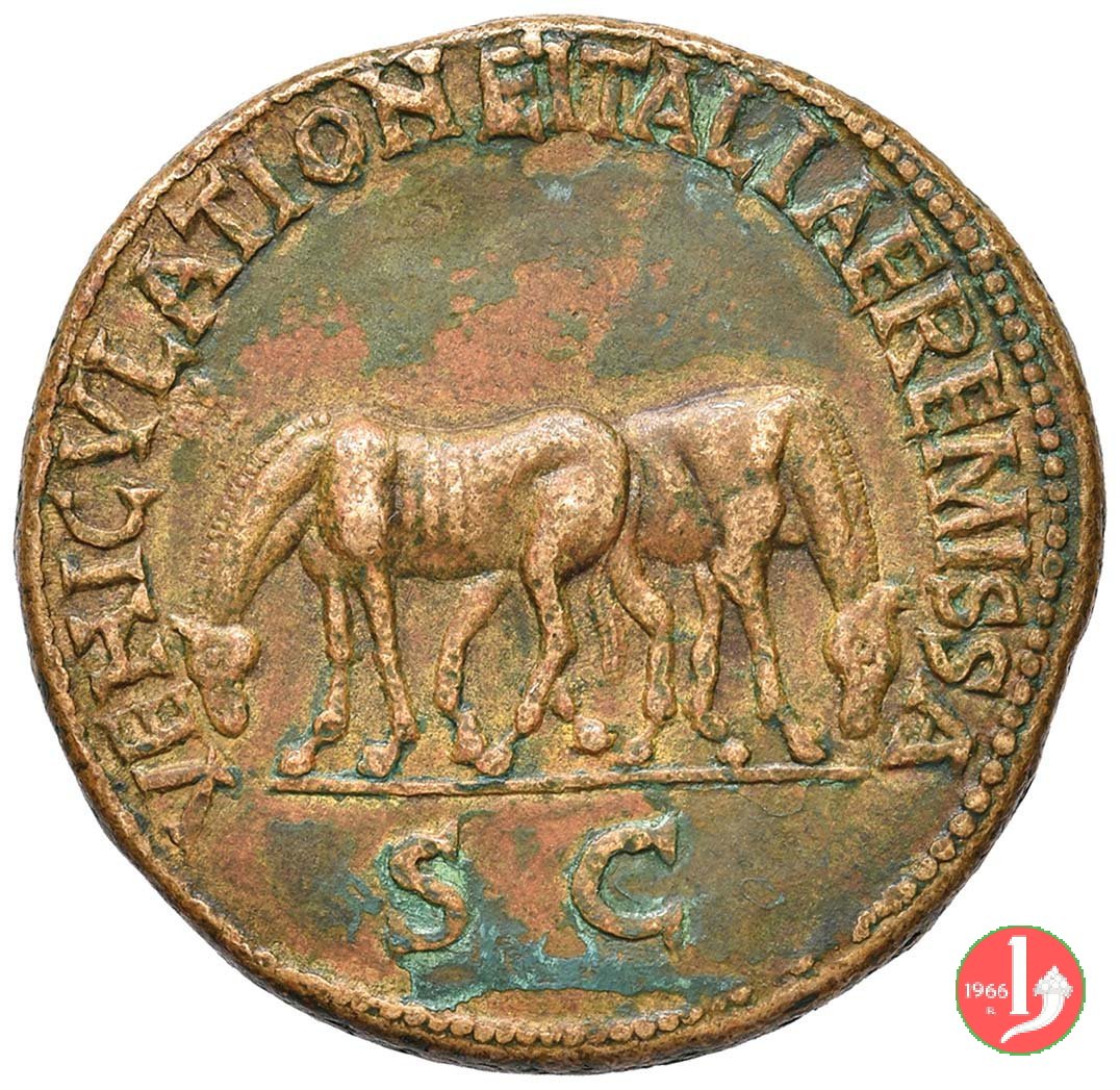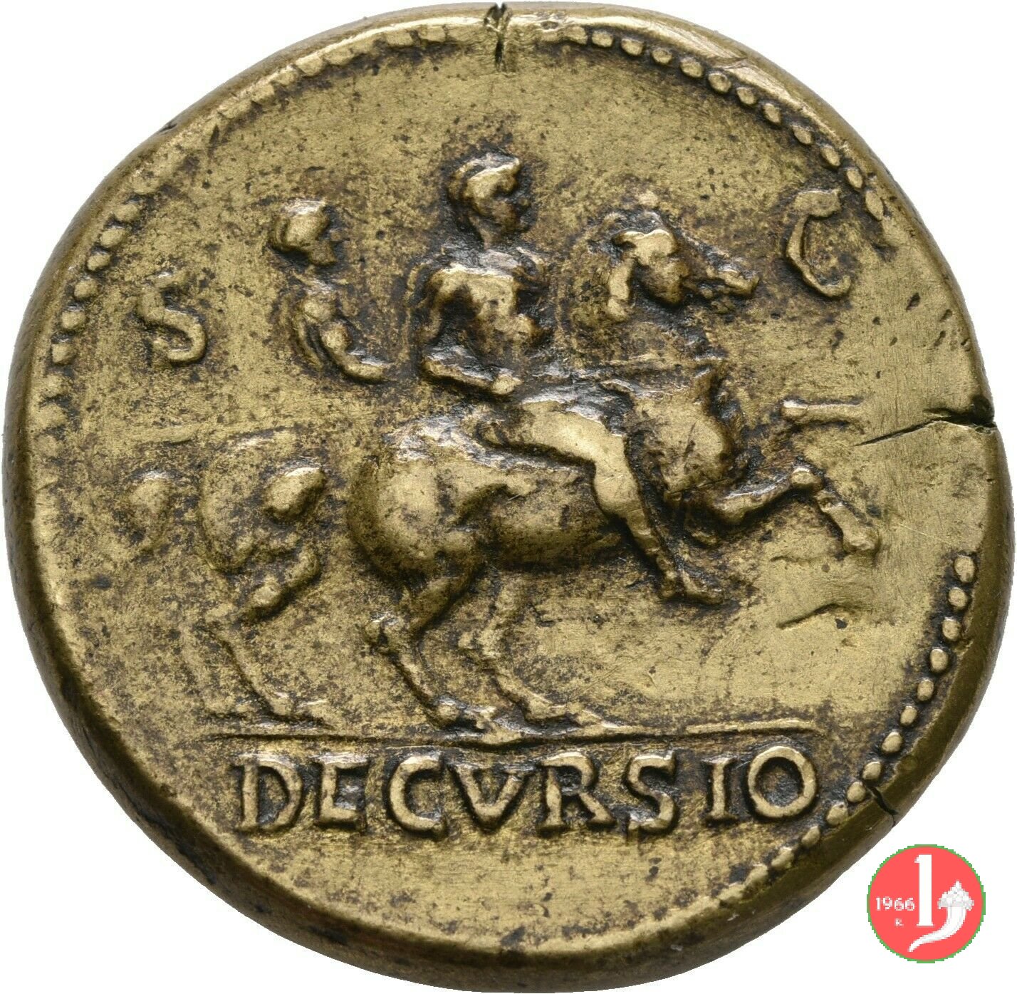 Caligola (37-41 dc) -L13 Dritto: CCAESAR DIVI AVG PRON AVG • PM TRPIIIIP busto laureato a sx L'Imperatore, a sx, in piedi e su base, impartisce ordini ai soldati che recano aste con aquile, ai lati: S _ C in esergo: COM • | |