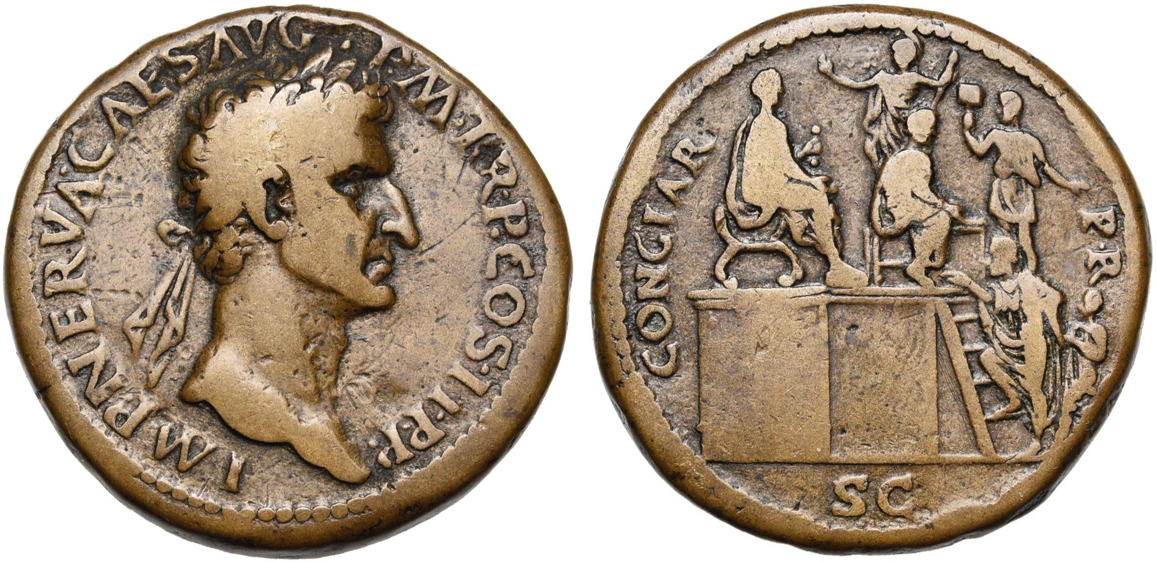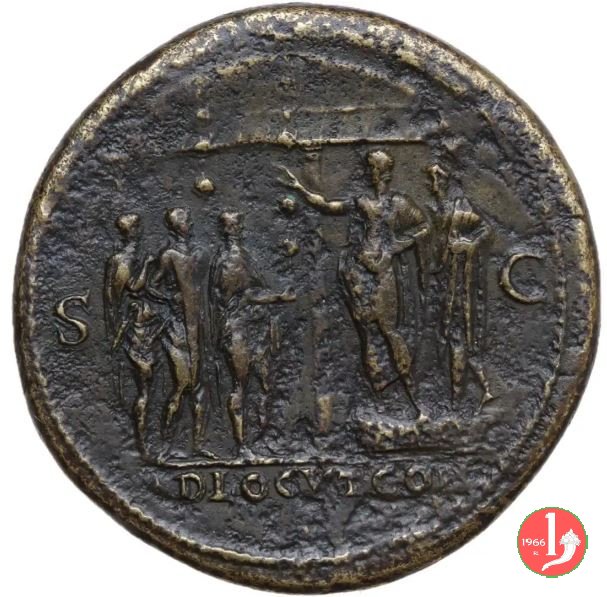 Nerva (96-98) - Adlocvt -L43 Dritto: IMP • NERVA • CAES • AVG • P • M • TR • P • COS • II • P • P busto L'Imperatore, a sx, in piedi e su base, impartisce ordini ai soldati che recano aste con aquile ai lati: S _ C | |