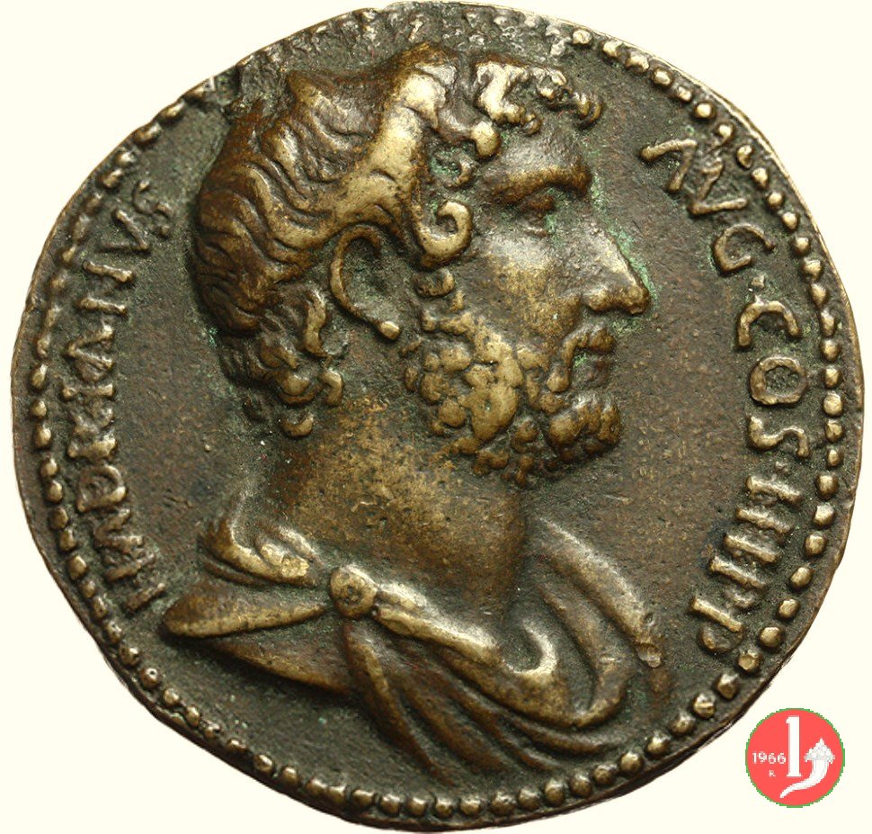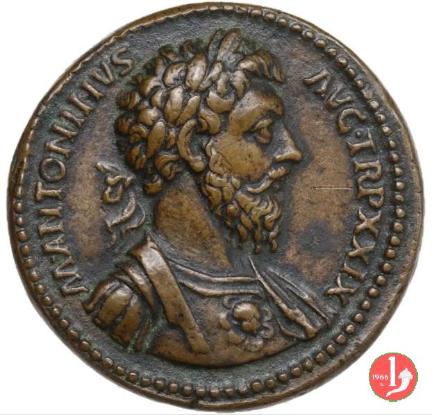 Marco Aurelio (161-180) -L56 Dritto: M • ANTONIVS _ AVG • TR • P XXIX busto laureato e corazzato a dx la figura allegorica della Vittoria alata seduta a dx, regge scudo ovale su cui VIC = AVG | |