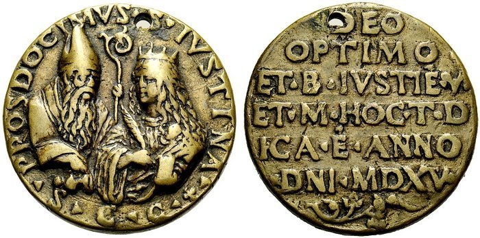 San Prosdocimo e Santa Giustina 1515 -V175 Dritto: S • PROSDOCIMVS • S • IVSTINA • = C C Busti accollati a dx dei due Santi, uno con mitra e pastorale, l'altra con corona e penna | |