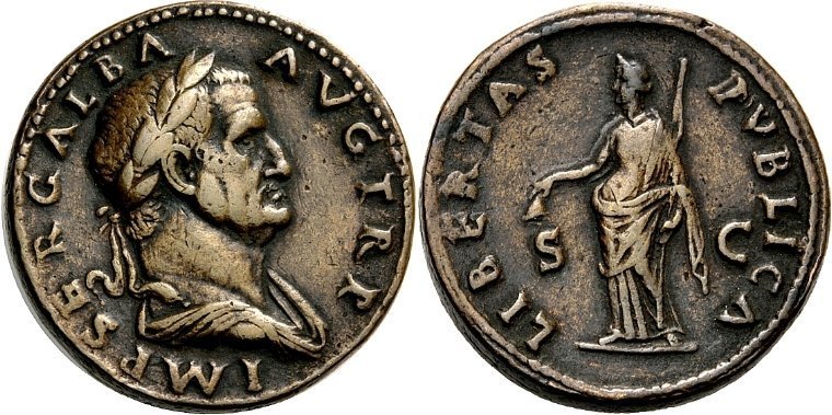 Galba (68-69 dc) -Libertas Publica Dritto: IMP SER GALBA _ AVG TRP busto laureato a dx La figura allegorica della libertà in piedi velata, volta a sx, regge asta ai lati: S _ C | |