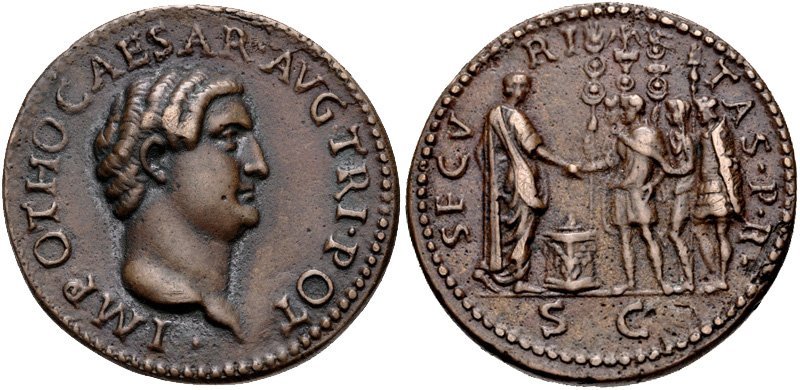 Ottone (69 dc) -L22 Dritto: IMP • OTTO • CAESAR • AVG TRIPOT busto a sx La figura allegorica della sicurezza in piedi, regge serto d'alloro ai lati: S _ C | |