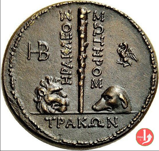Ercole Dritto: busto a dx con serto di quercia Verso: HEPAKLEOS SWTHPOS Clava tra teste di leone e di cane ai lati, nel campo: HB-aquila in volo a sx in esergo: TPAKWN | |