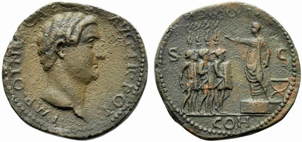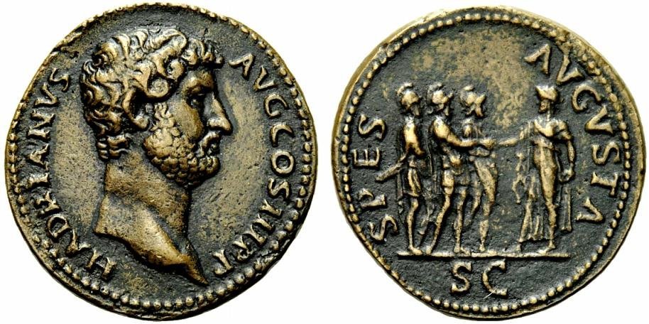 Adriano (117-138 dc) -Spes augusta Dritto: HADRIANVS AVG COS III PP busto a dx la figura allegorica della Speranza in piedi, velata e volta a sx stringe la mano a tre legionari elmati in esergo: SC | |
