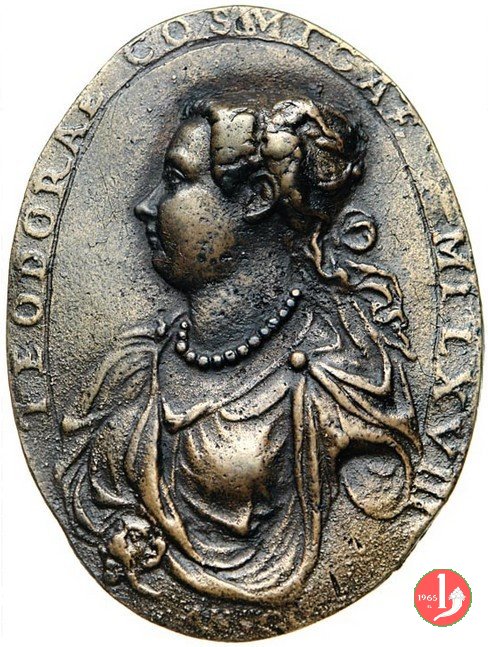 Teodora Cosmico Dritto: TEODORAE COSMICAE MDLXVIII busto a sx con collana di perle, abito drappeggiato e capelli raccolti sul capo da trecce e legati con nastro sotto: AN. GO. | |