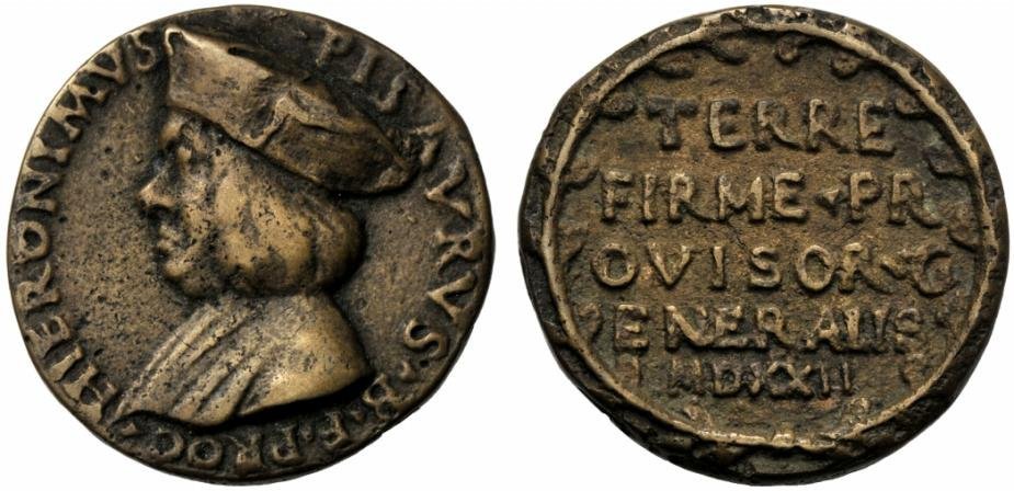 Girolamo Pesaro 1522 -V200 Dritto: PISAVRVS • B • F • PROC • HIERONIMVS busto a sx con cappello e tunica | |