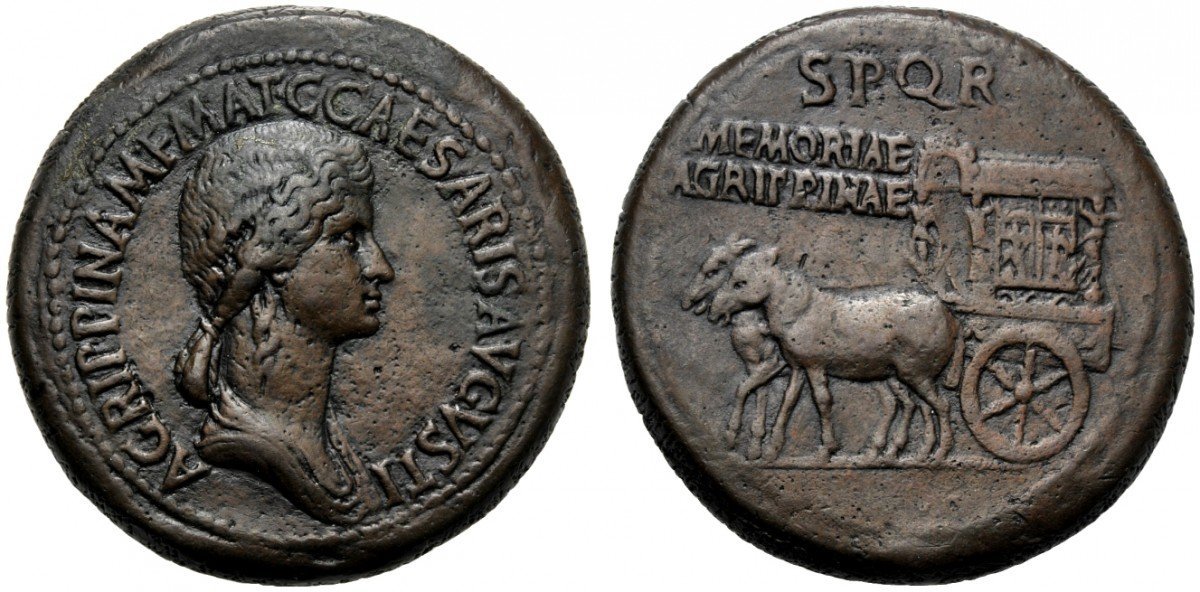 Agrippina Maggiore - Carpentum -L7 Dritto: AGRIPPINA • MF MAT • C • CAESARIS AVGVSTI busto paludato a dx carro funebre trainato da due muli verso sx | |