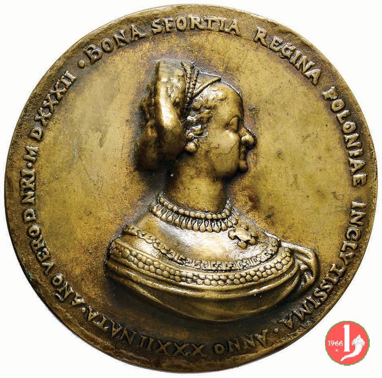 Bona Sforza Regina di Polonia 1532 Dritto: BONA SFORTIA REGINA POLONIAE INCLYTISSIMA • ANNO XXXII NATA • ANO VERO D NRI • M DXXXII • busto a dx con capelli raccolti da diadema, collana di perle e collare Albero di carciofi con nastro: TALIS _ ESTRO V _ A E _ | |