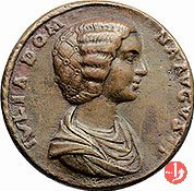 Julia Domna Dritto: IVLIA DOM _ NA AVGVSTA busto paludato a dx con rete tra i capelli la figura allegorica della Fecondità seduta su sedia a dx regge bimbo | |