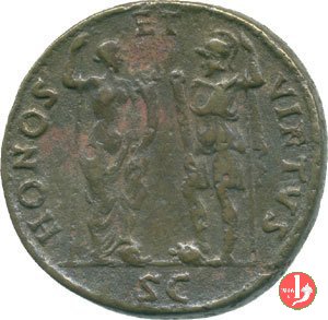 Vitellio (69 dc) -Honos et Virtus Dritto: A • VITELLIVS GERMANICVS IMP AVG • PM TRP • busto laureato e paludato a dx le figure allegoriche dell'Onore con scettro e cornucopia e della Virtú con lancia e spada affrontate in esergo: SC | |