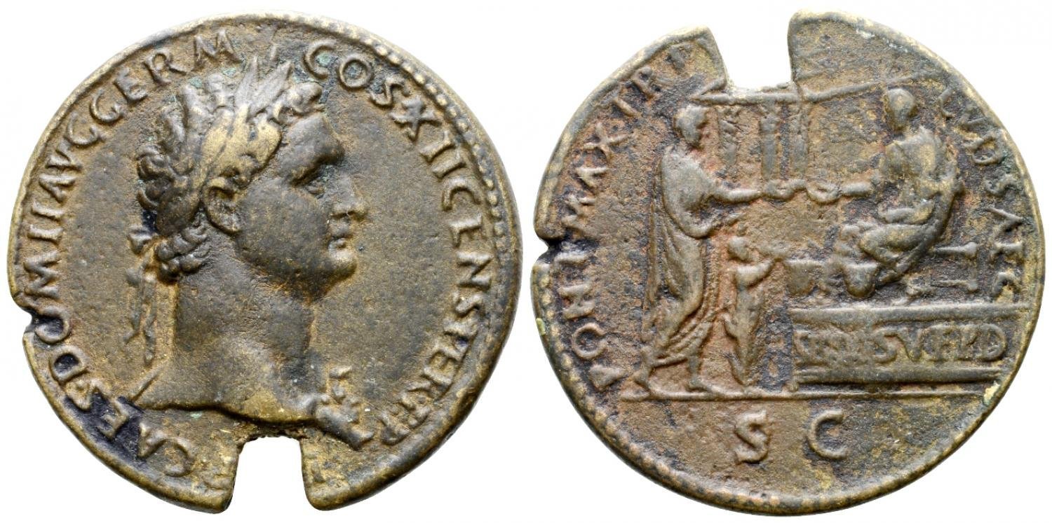 Domiziano (81-96 dc) -L40/3 Dritto: IMP • CAES • DOMIT AVG GERM • _ COS • XII CENS PER P P. busto laureato a dx l'Imperatore seduto in trono presso un tempio e volto a sx riceve doni da uomo con bambino sulla base del trono: S P Q R SVPPD in esergo: S C | |