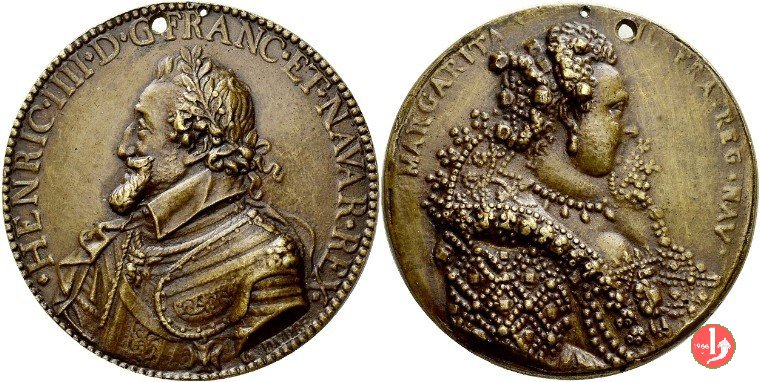 Enrico IV e Margherita di Valois Dritto: _ • HENRIC • IIII • D • G • FRANC • ET • NAVAR • REX • busto corazzato e laureato a sx con mantello sotto la spalla: G. DUPRE' busto a dx con abito decorato con perle, diadema e collana di perle | |