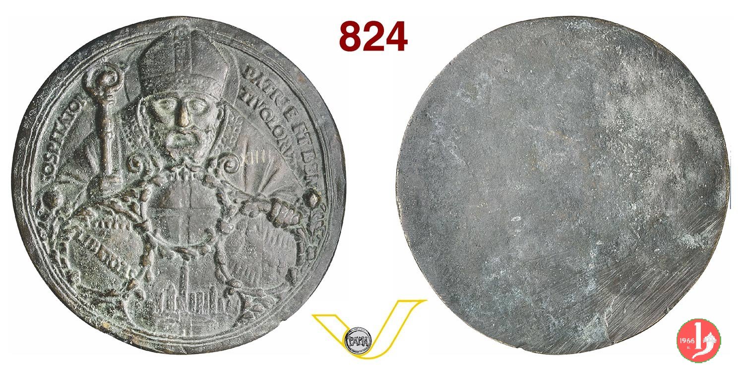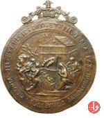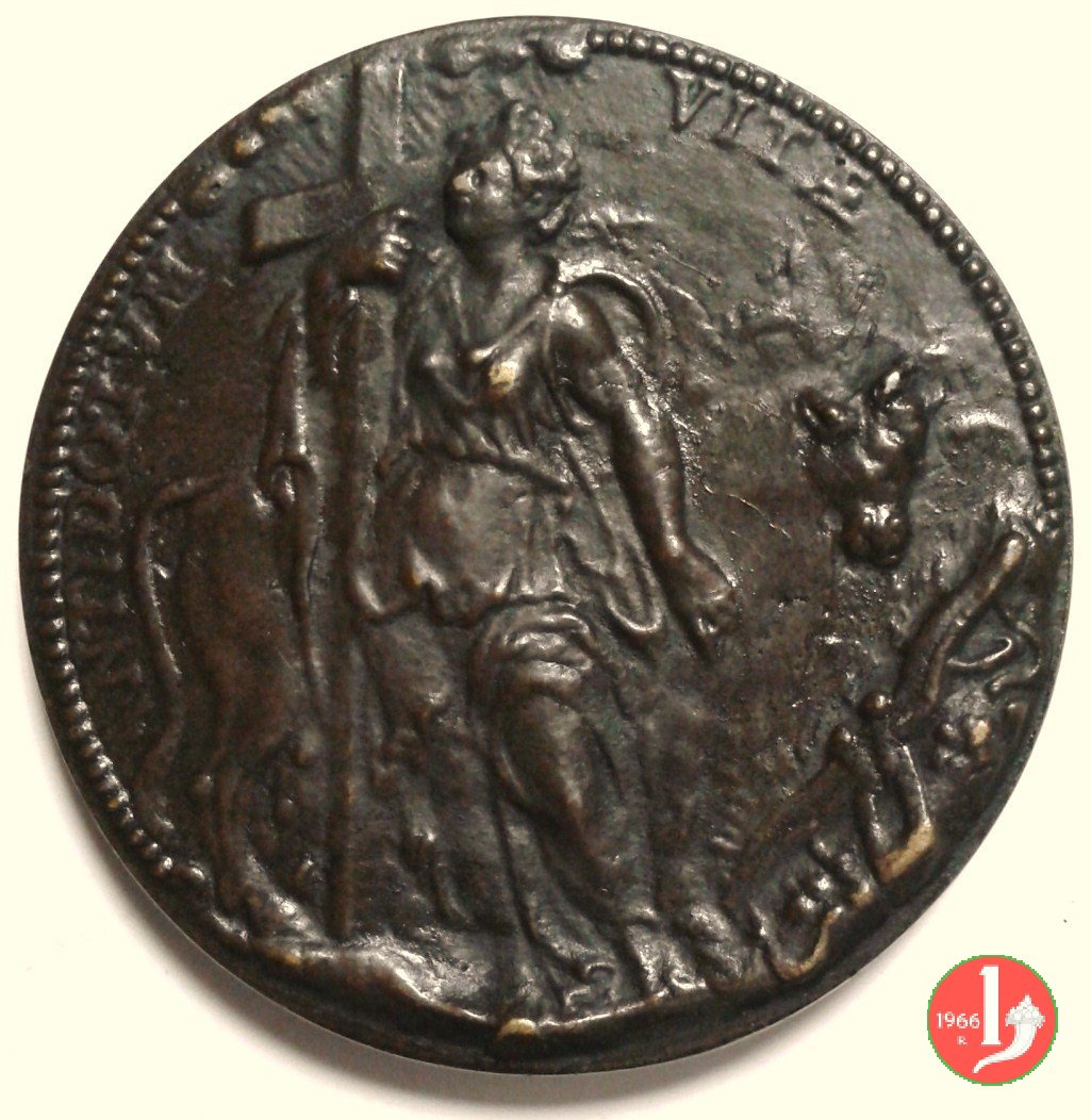 Vincenzo Bovio Dritto: VINC • BOVIVS • BONONIEN _ PROTHONOT • APOST busto a sx con camicia la figura allegorica della religione, in piedi, di fronte regge Croce irraggiata da nube; dietro toro, volto a dx; in basso, a dx: giogo | |