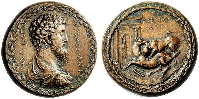Imperatore Commodo Dritto: entro corona: busto drappeggiato e corazzato a dx dell'Imperatore Commodo ai lati, in verticale: M KOMOΔ ANT _ AYΓ IMD Leone assalta cavallo sullo sfondo: figura sotto ad arco nel campo in alto: ΦOEΛIKIT = AYΓ | |