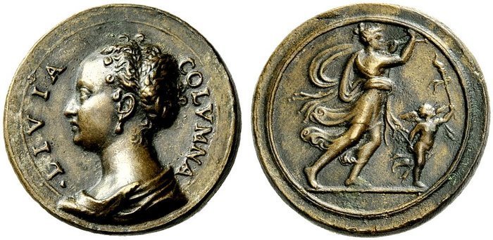 Livia Colonna Dritto: _ • LIVIA _ COLVMNA Busto drappeggiato a sx con orecchini di perle e capelli raccolti con treccia sul capo | |