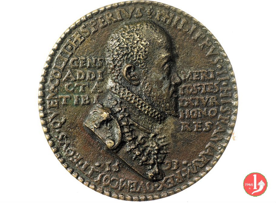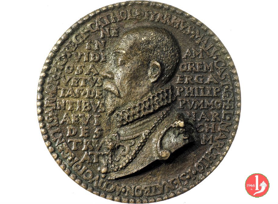 Pirro Malvezzi 1593 Dritto: AMOR • PRO • REGE • CATHOLS • PYRRIIVS • MALV • CAST • GHEL • MARCHIO • SENALEON • busto corazzato a dx con bavero alla Spagnola e collare nel campo a sx: NE = IN = VIDI = OSA = VETUS = TAM • DE = NTIBVS = AEVI = DES = TRV = AT nel campo a dx: AM = OREM = ERGA = PHILIP = PVMMO = NAR = CH = IM busto corazzato a sx con bavero alla Spagnola e collare nel campo a sx: GENS = ADDI = CTA = TIBI nel campo a dx: VERI = TOS • TES = TXTVR = HONO = RES | |