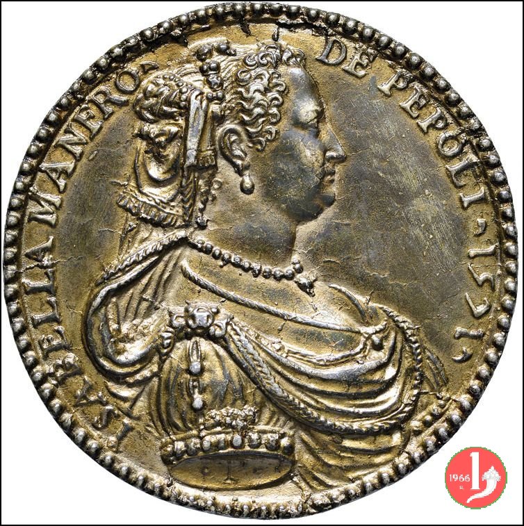 Isabella Manfroni 1571 -VT1872 Dritto: ISABELLA MANFRO • _ DE PEPOLI • 1571 • busto a dx con capelli raccolti da file di perle e veli, abito riccamente decorato e collana di perle sul taglio spalla: • P • | |