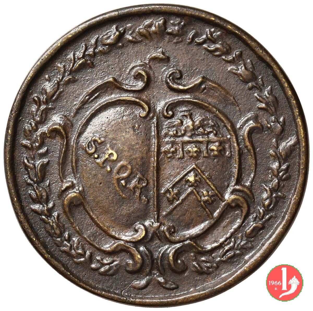 San Petronio Dritto: SOSPITATOR _ PATRI ET BEN = TIVOLORVM Busto nimbato di fronte con mitra, piviale e pastorale, regge tre medaglie contenute entro girali floreali che sormontano la vista della città di Bologna nelle tre medaglie: LIBERTAS in banda _ Croce _ quadripartita | |