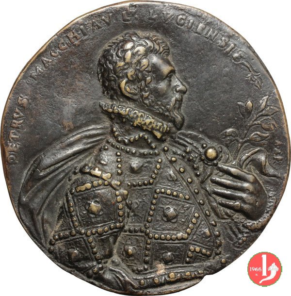 Lugo - Pietro Macchiavelli Dritto: PETRVS MACCHIAV L • LVGIENSIS _ A • AF busto a dx con gorgiera, corazza borchiata e mantello, regge piantina | |