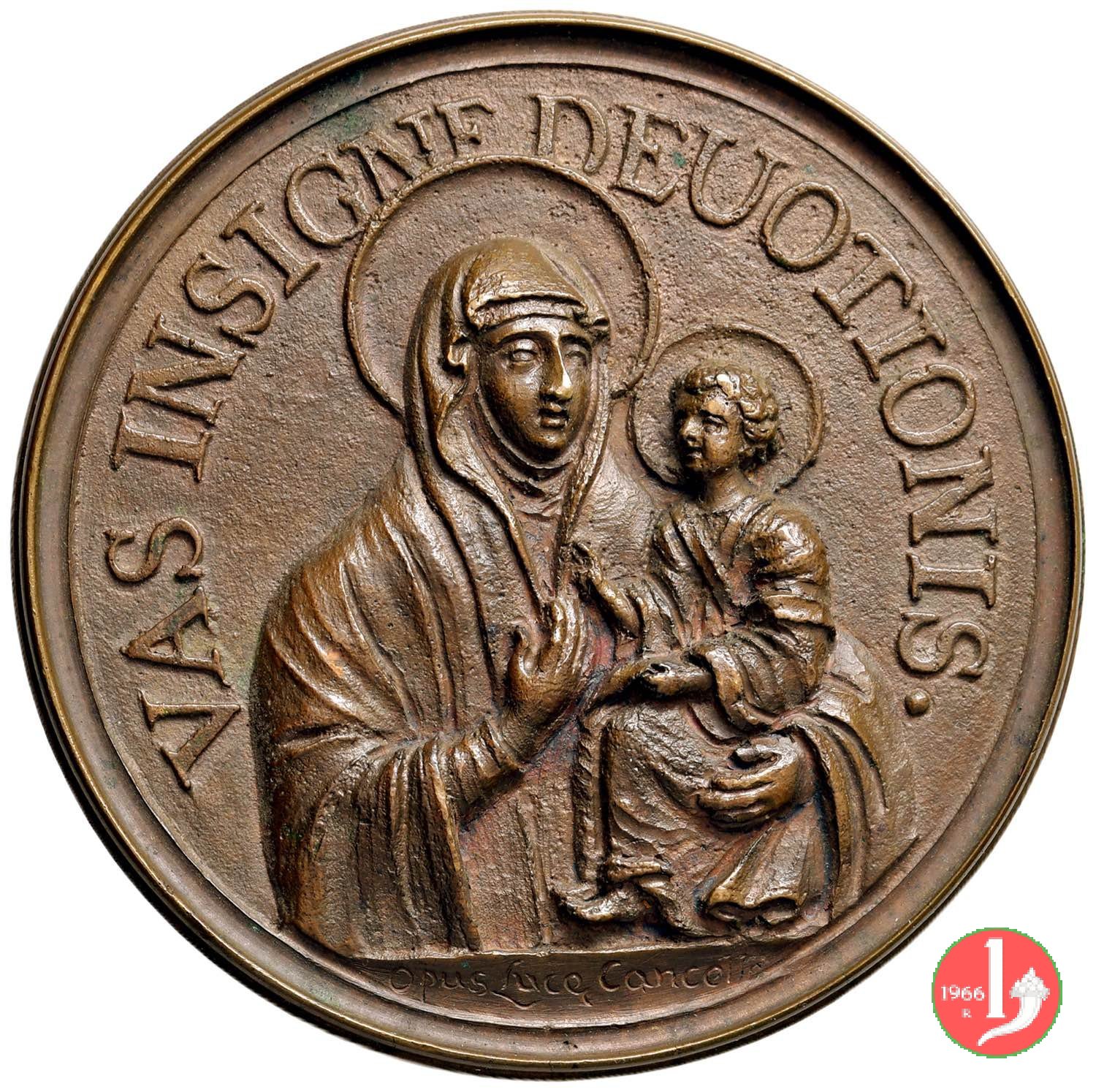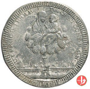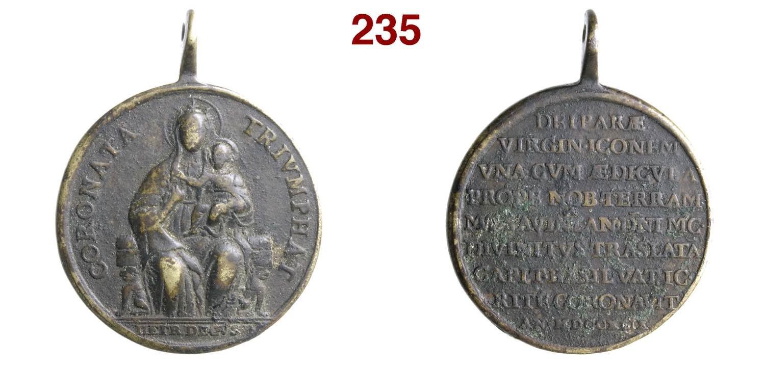 Verso: nel campo: DEIPARAE = VIRGINI • ICONEM = VNA CVM AEDICVLA = PROPE NOB • TERRAM = MASAVINI AN • DNI MC • = DIVINITVS TRASLATA = CAPIT • BASIL • VATIC • = RITE • CORONAVIT = AN • MDCCXLIX