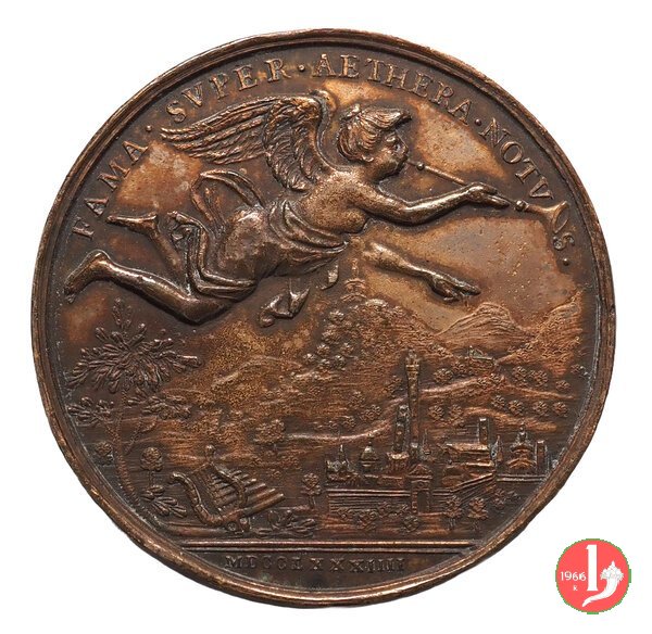 la figura allegorica della Fama in piedi su libri, appoggiata a busto, regge specchio e serto d'alloro; sullo sfondo a sx tempietto circolare con architrave recante HONOS