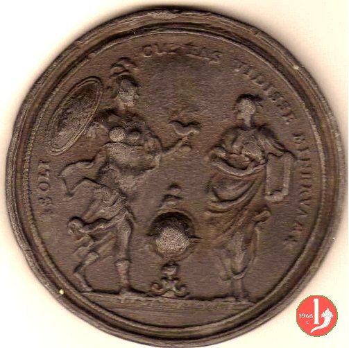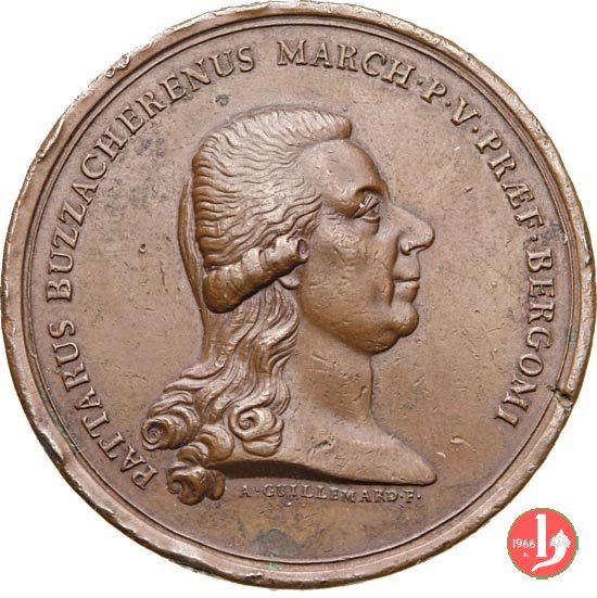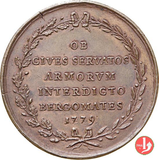 Verso: entro rami d'alloro e quercia legati in basso da nastro: OB = CIVES SERVATOS = ARMORVM = INTERDICTO = BERGOMATES = 1779