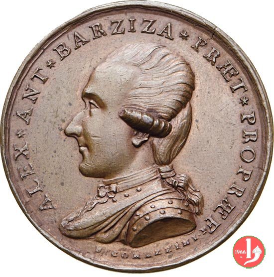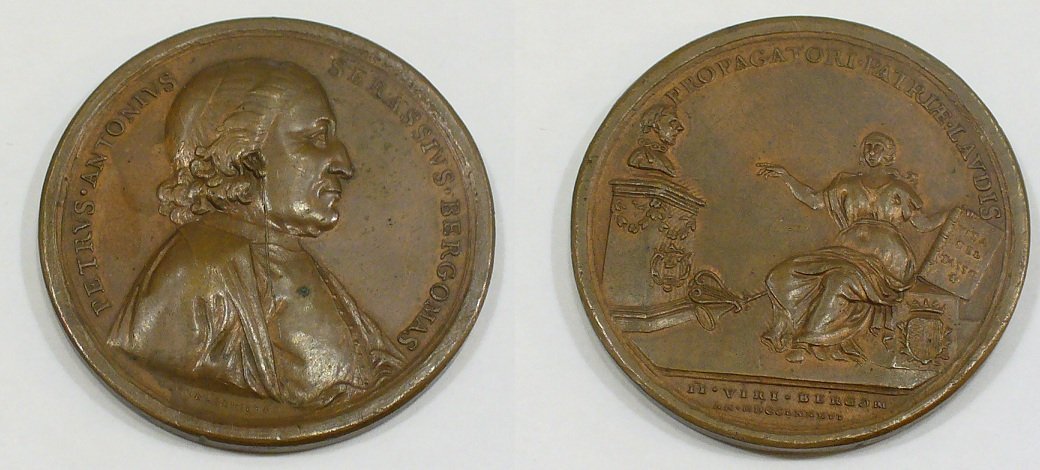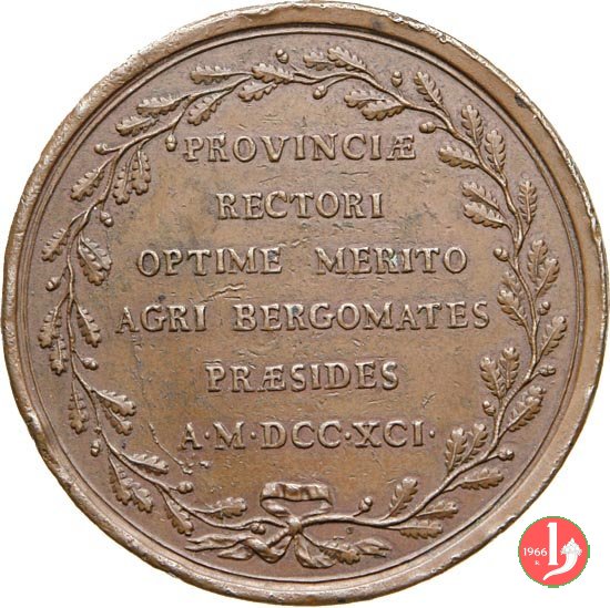 Verso: tra rami di quercia legati in basso da nastro: PROVINCIAE = RECTORI = OPTIME MERITO = AGRI BERGOMATES = PRAESIDES = A • M • DCC • XCI •
