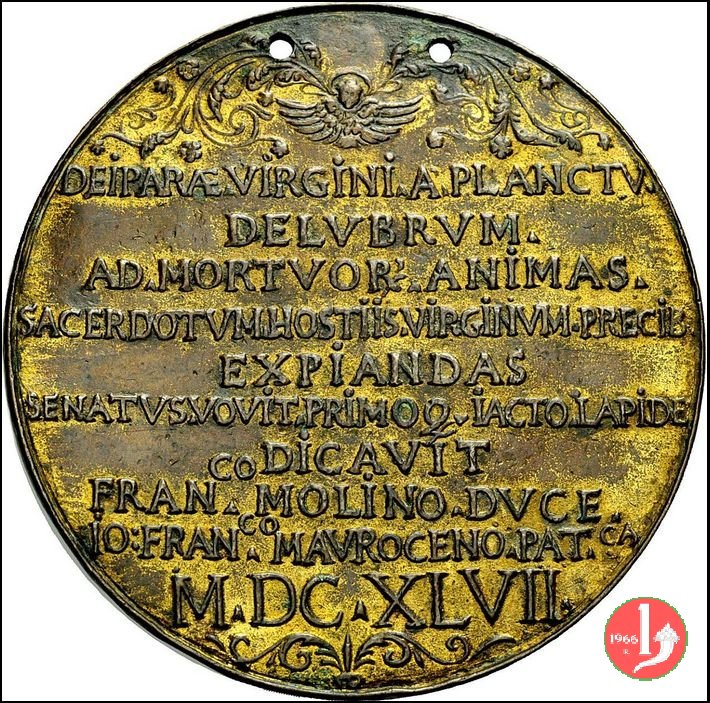 Chiesa di Santa Maria del Pianto 1647 -V940 Dritto: La B.V. Addolorata, incoronata da due angeli, prega di fianco al corpo del Cristo morto Verso: nel campo: cherubino entro fregio = DEIPARAE. VIRGINI. A. PLANCTV. = DELVBRVM. = AD. MORTVOR. ANIMAS. = SACERDOTVM. HOSTIIS. VIRGINVM. PRECIB. = EXPIANDAS = SENATVS. VOVIT. PRIMOQ. IACTO. LAPIDE = DICAVIT = FRAN.co MOLINO. DVCE. = IO | |