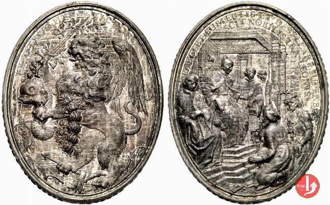 Vittoria sui Turchi -V1055 Dritto: ROBVR MEVM CA _ NIS INTERITVS • in alto entro medaglia delimitata da rami di palma: MARC ANT _ IV VENETIAE DVX busto a dx con corno e manto dogale in basso: leone azzanna lupo in fuga a dx M • B • | |