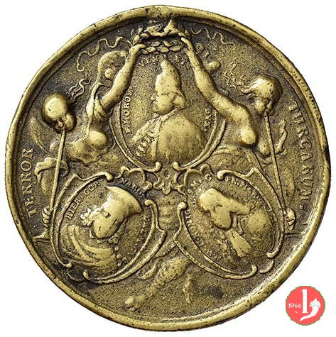 Giovanni III Sobieski 1684 -V1037 Dritto: su ampio bordo e su quattro righe: IOANNI III REGI POLONIARUM ORTHODOXO FIDEI DEFENSORI EXCETUUM CHRISTIANITATIS = GENERALISSIMO DUCTORI TURCARUM DEBELLATORI TARTARORUM FUGATORI VIENNAE AUSTRIAE AB = OBSIDIONE TURCICA A 1683 DIE 12 SEPT LIBERATORI HUNGARIAE RECUPERATORI POLON = CONSERVATORI M • D • MOSCOV • ET REIPUBL • VENETIAR • AD BELLUM COMUNE INDUCTORI = PATRI PATRIAE DIVO PIO IUSTO FELICI AUGUSTO SACRUM entro rami di palma: busto coronato e paludato a dx sul taglio Aquila Polacca tra l' aquila Austriaca e l'aquila Russa, sormontano leone di San Marco su nubi e volto a sx sopra a paesaggio, regge Vangelo aperto PAX = TIBI = MAR _ CE EV = AN = ME sul paesaggio indicazione delle città: BUDA _ CAND _ CAN _ CONST | |