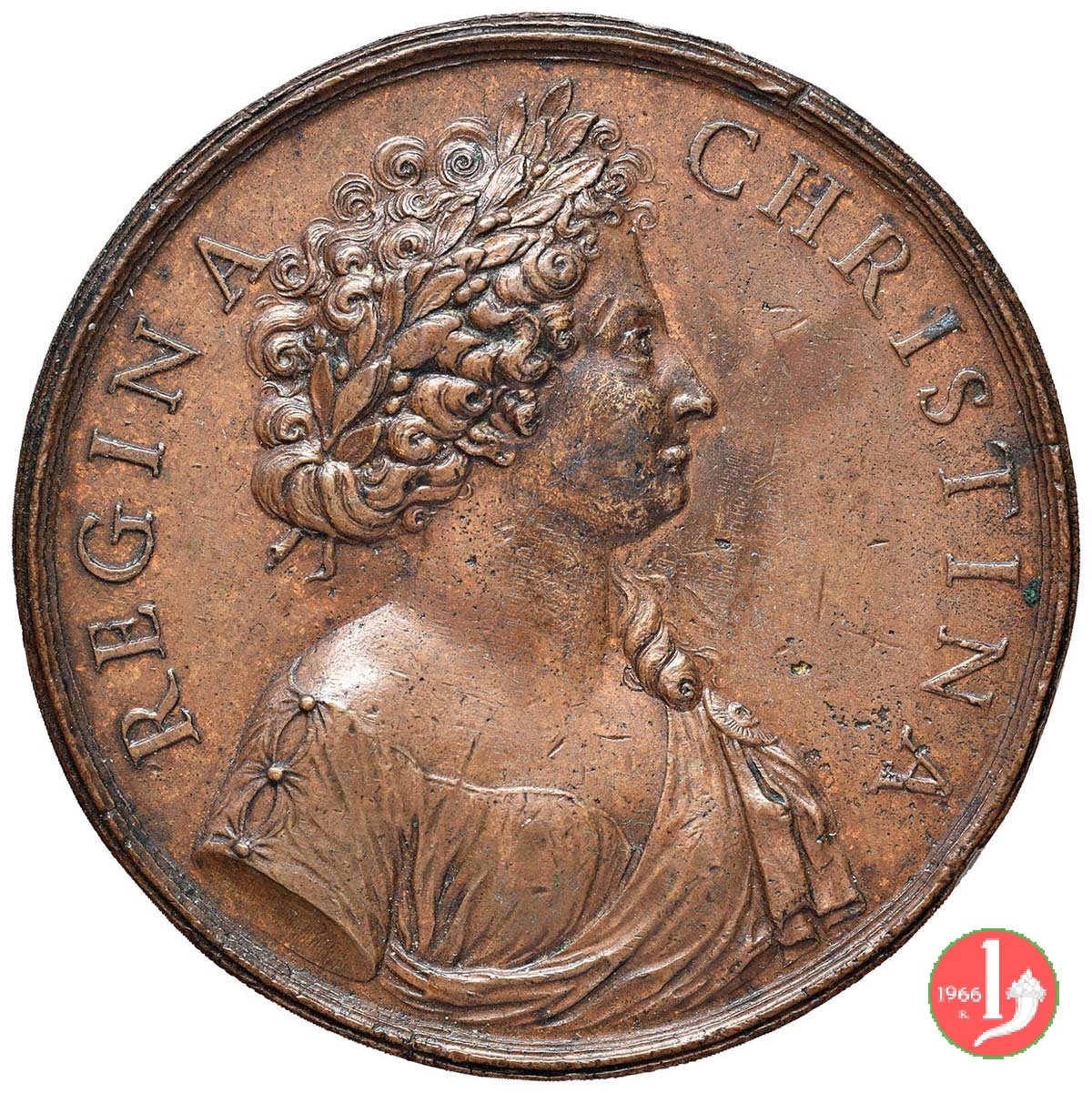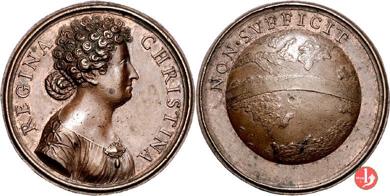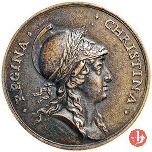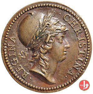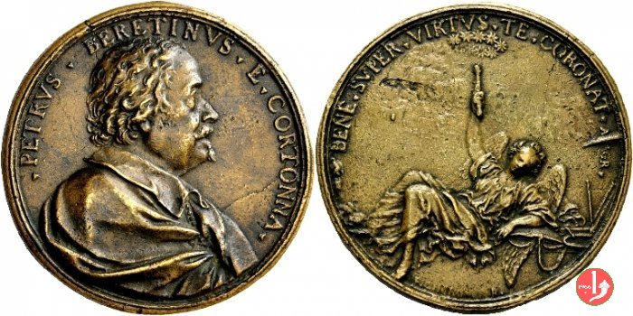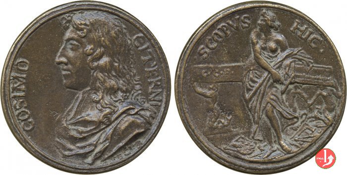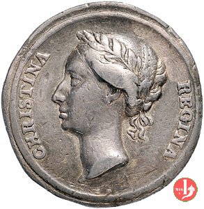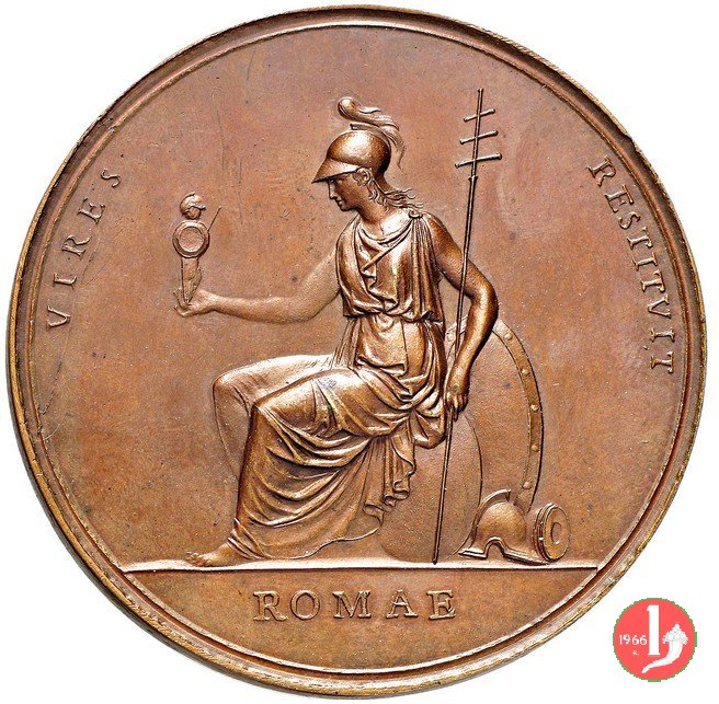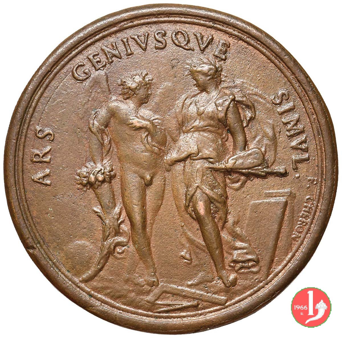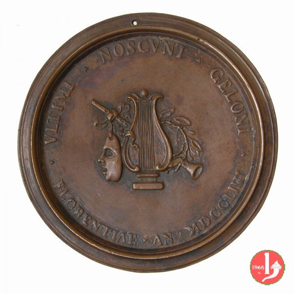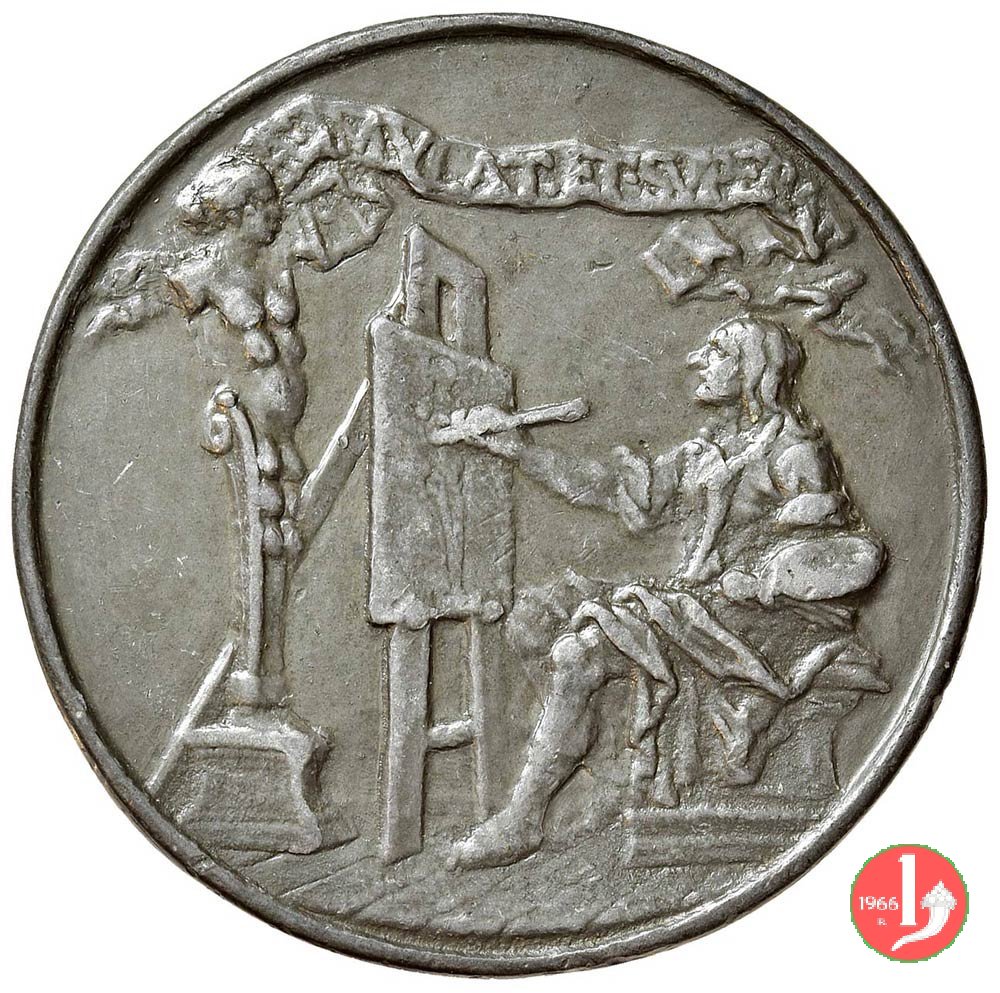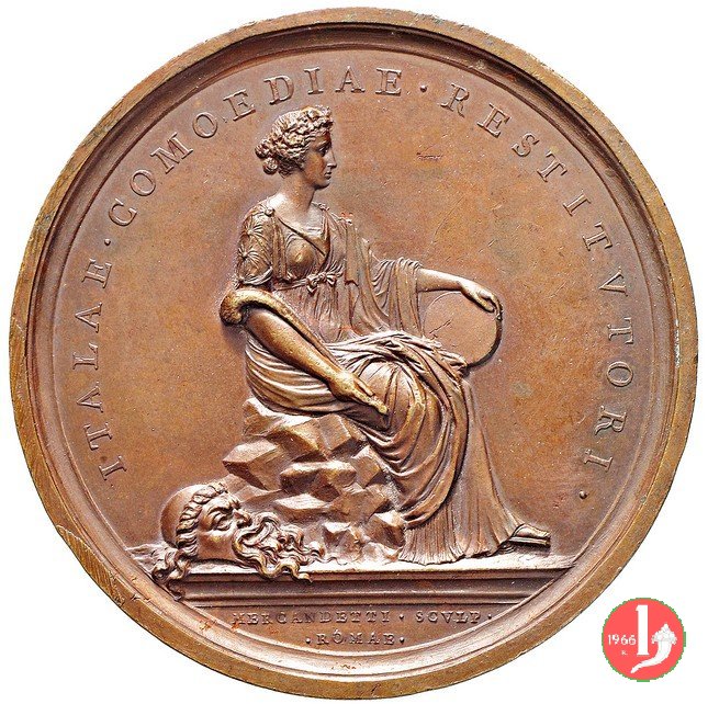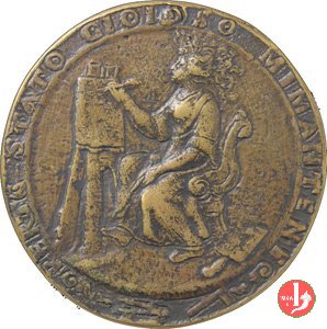 figura femminile in piedi, laureata e paludata, volta a dx, regge lira presso un tavolo su cui serto d'alloro e miniatura ovale con ritratto