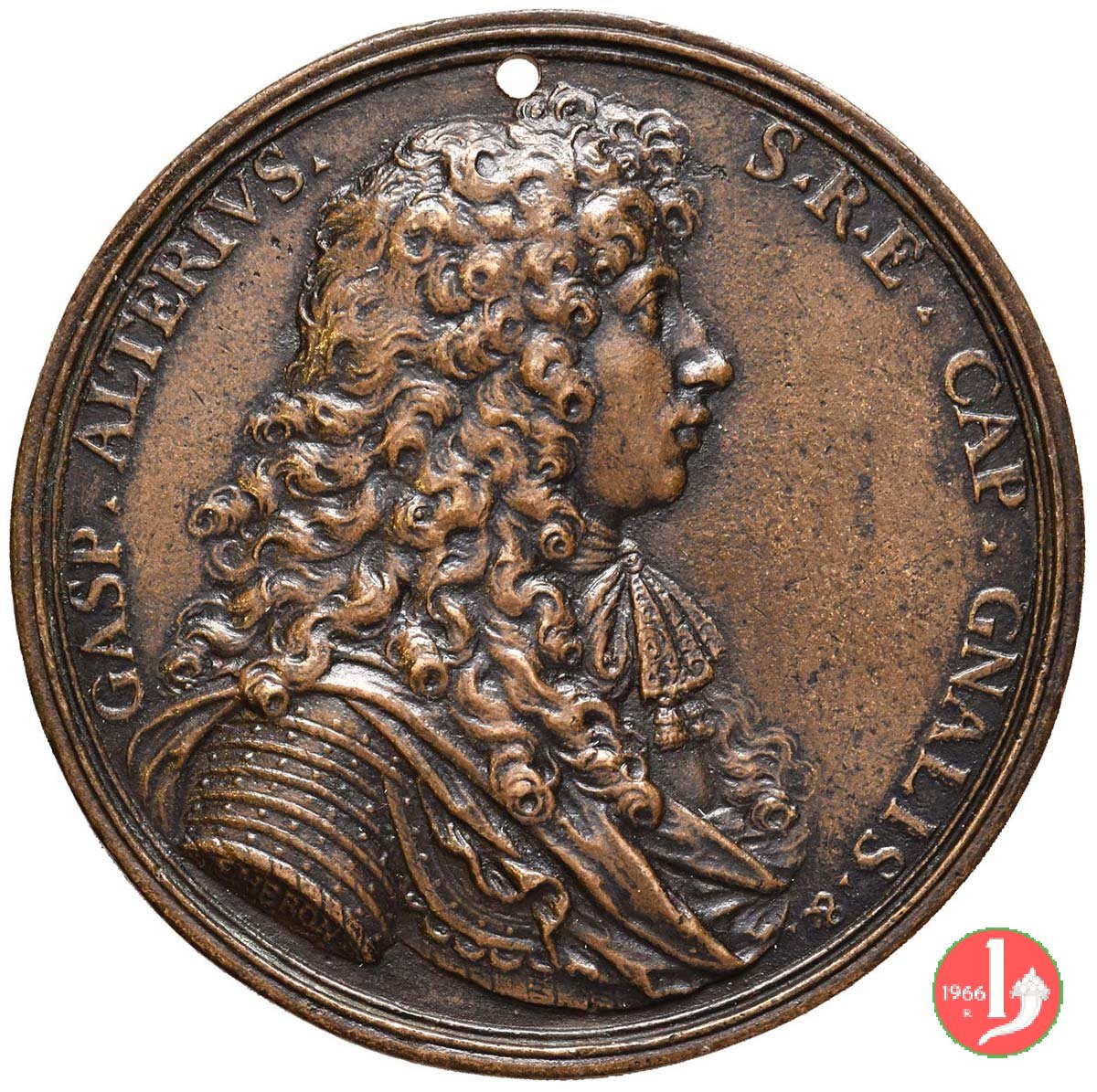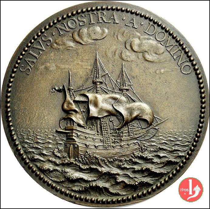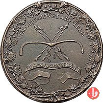 Verso: nel campo: LA = COMPAGNIA = DE BOMBARDIERI = ESSENDO CAPO LONAR = DO ROSETTO POLO DE = POLO GAST • E GIO •PA = IARDI VIC • RESTAURO = LA SCUOLA DI S BAR = BARA SVA PROPETTR = MARINO GRIMA = NI DVCE