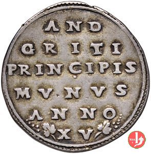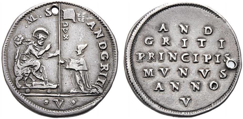 Verso: nel campo: AND = GRITI = PRINCIPIS = MVNVS = ANNO = VI (tra foglie di vite e punti)