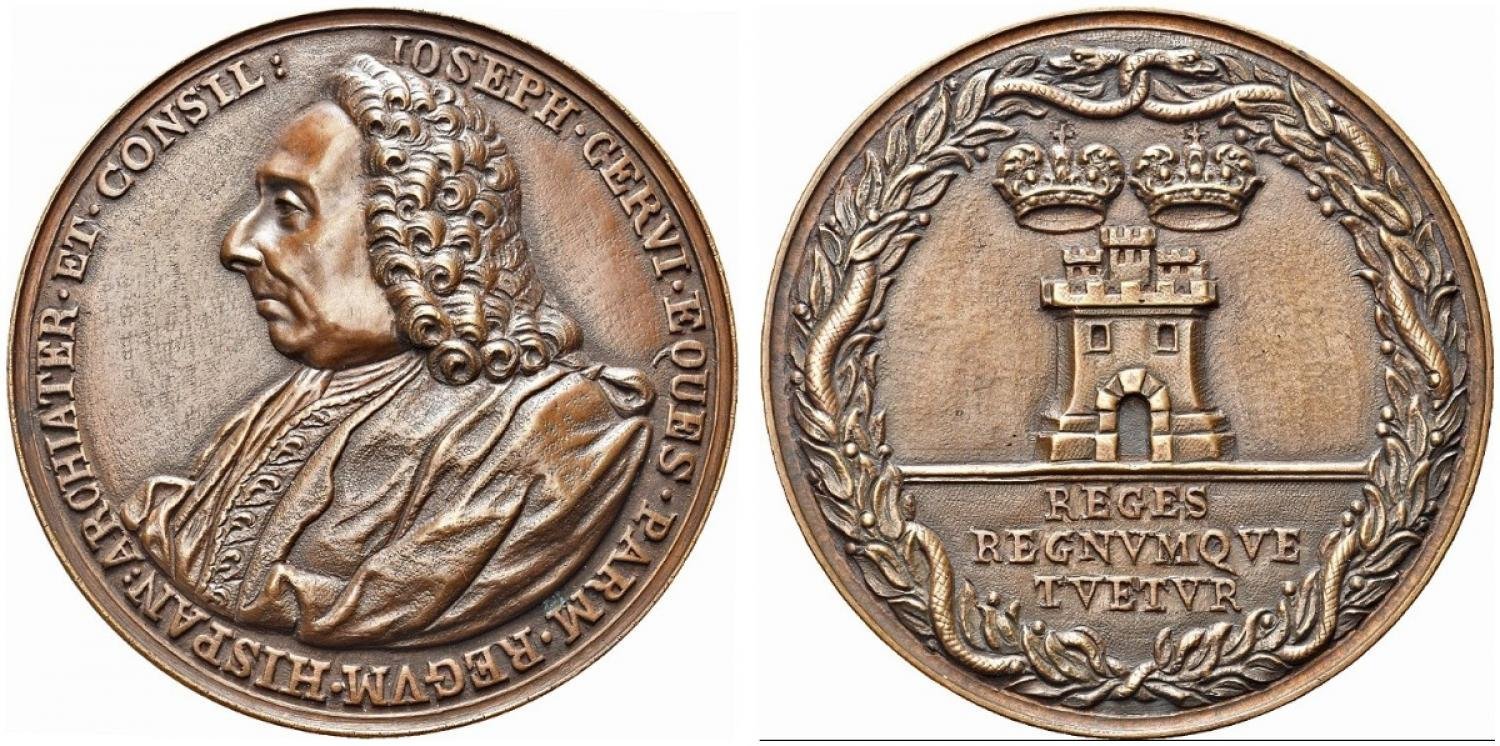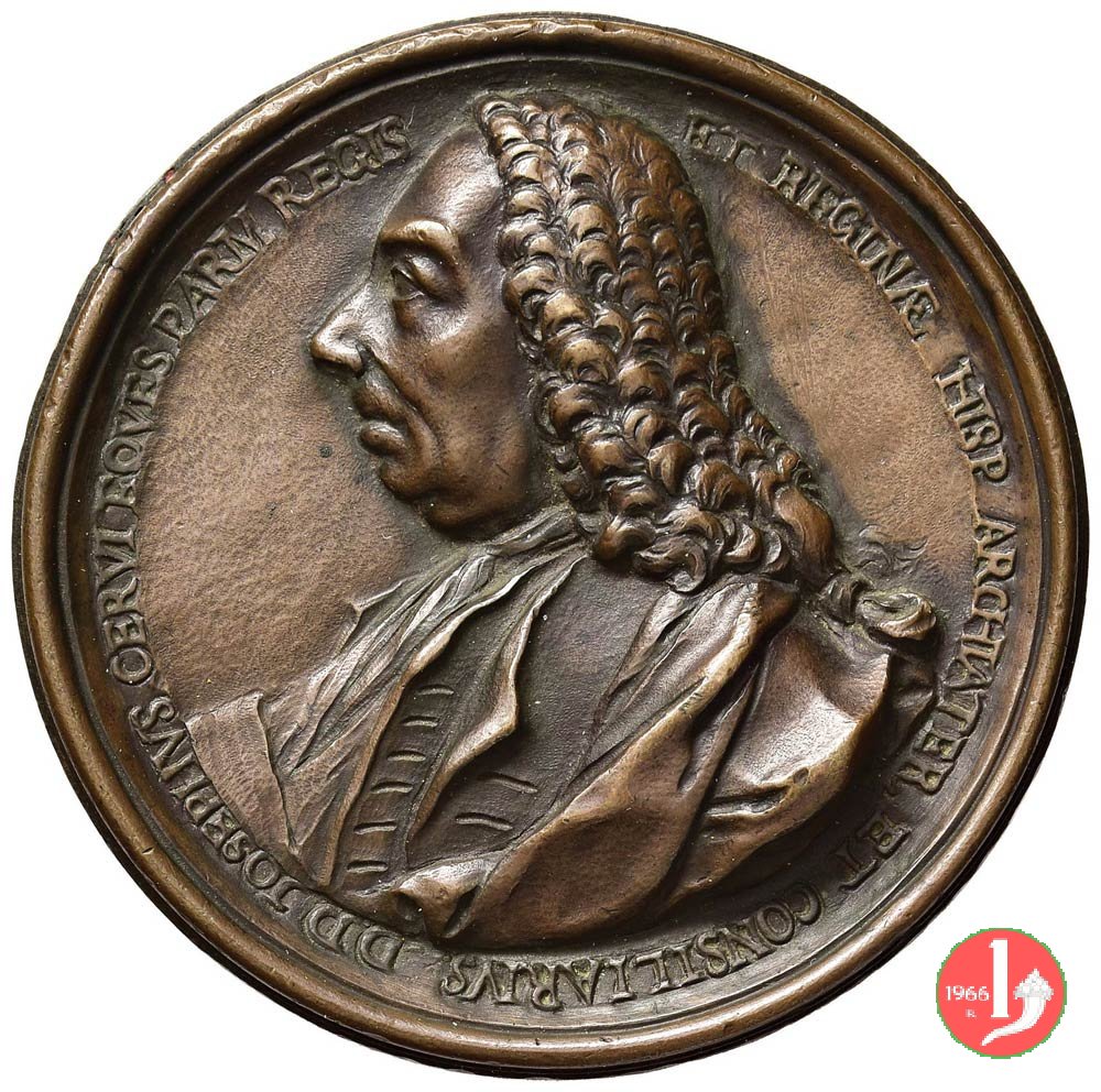 Dritto: D.D. JOSEPHVS CERVI EQVES PARM REGIS _ ET REGINAE HISP ARCTECTATE ET CONSILIARIVS.