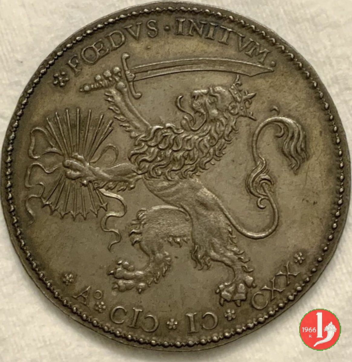 Verso: entro ghirlanda di foglie e bacche e tra volute: i tre stemmi ovali affiancati della Lega Grigia (Croce), della Cadia (stambecco rampante a sx) e delle Dieci Giurisdizioni (uomo selvaggio)