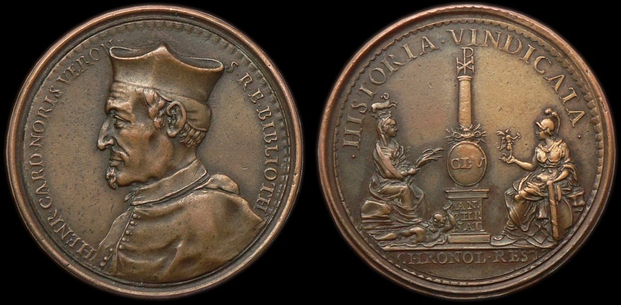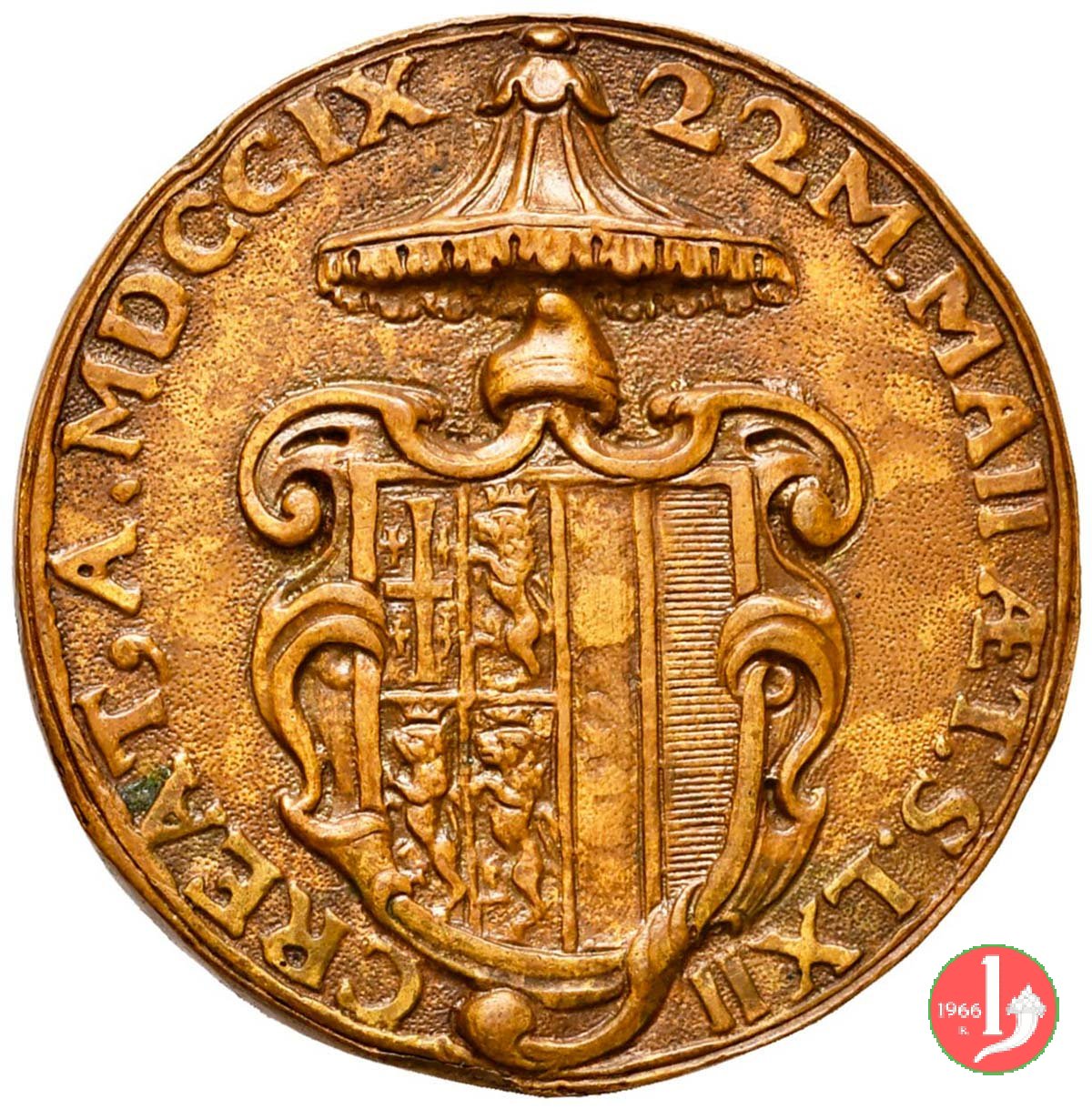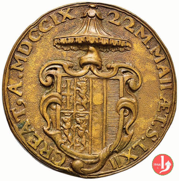 Dritto: Busto di fronte con berretto e mozzetta, entro ovale tra fregi e due teste di cherubini, in alto, fermato in basso da Stemma Cardinalizio sormontato da galero a dieci nodi
