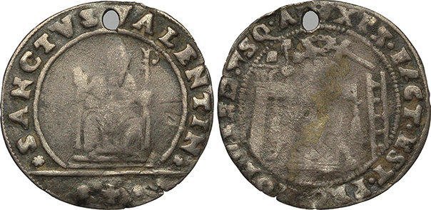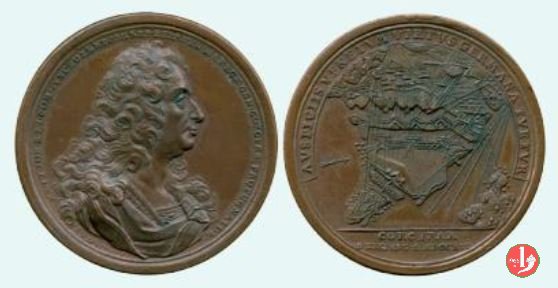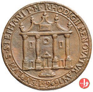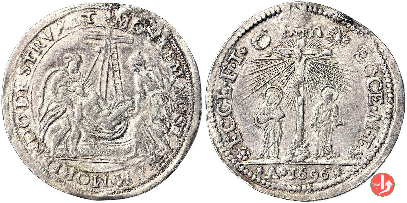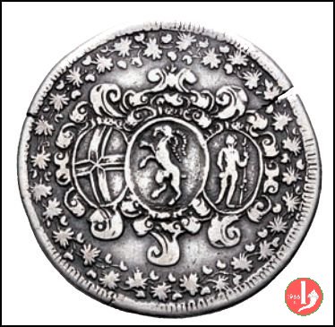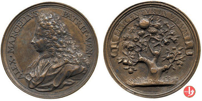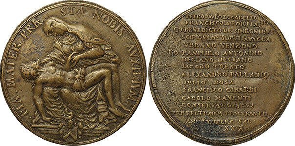 Verso: nel campo: PETRO PAVLO LOCADELLO _ IC = FRANCISCO A FORTIA = CO : BENEDICTO DE SIMEONIBVS = SCIPIONI DE SBRVLIAVACCA = VRBANO VENZONO = CO : PAMPHILO ANTONINO = DECIANO DECIANO = IACOBO TRENTO = ALEXANDRO PALLADIO = IVLIO ROSA = FRANCISCO GIRARDI = CAROLO MANENTI = CONSERVATORIBVS = PERFECTIONEM PROCVRANDIB = ANNO CHR FERAE SAL = MDCLXXXX