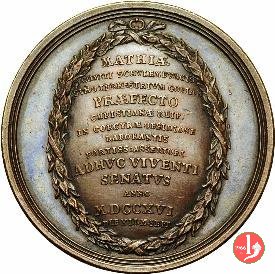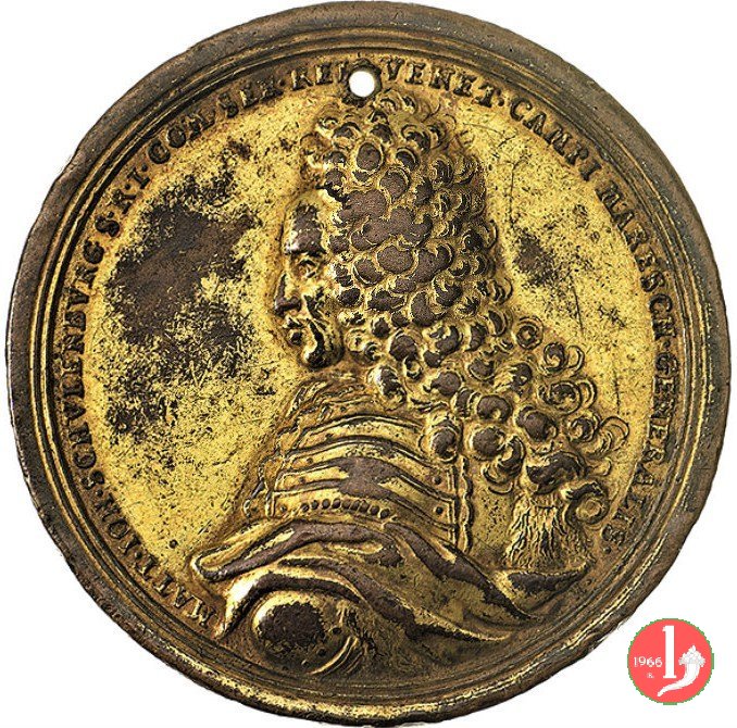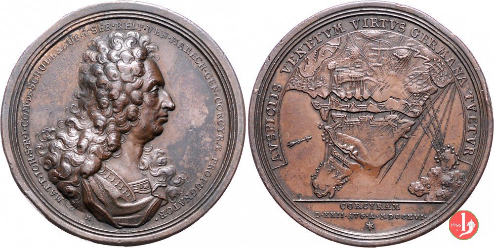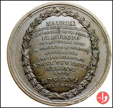 Verso: nel campo, entro corona ogivale di calici floreali legata da nastri ai quattro lati: MATHIAE = COMITI SCHVLEMBVRGIO = SVMO TERRESTRIVM COPIAR = PRAEFECTO = CHRISTIANAE REIP = IN CORCVRAE OBSIDIONE = LABORANTIS = FOTISS : ASSERTORI = ADHVC VIVENTI = SENATVS = ANNO = MDCCXVI = DIE XII • M • SEPT