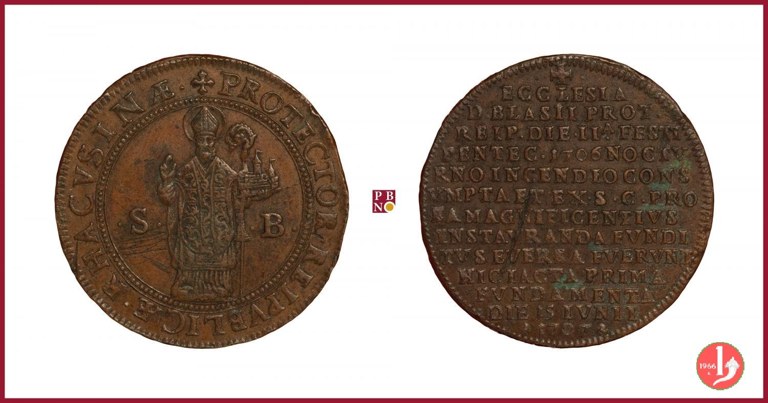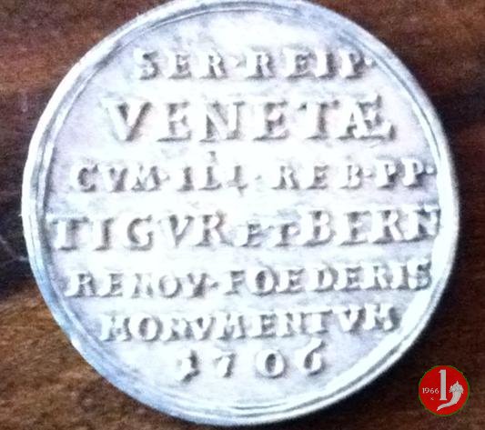 Verso: nel campo, tra due fregi floreali, in alto e in basso: PRINCIP • MVNVS = S • C • = ANT. VERVDA NAVIS OPIF = FRAN • BEMBO = ARSEN • PATRONO = A • D • MDCCXVII