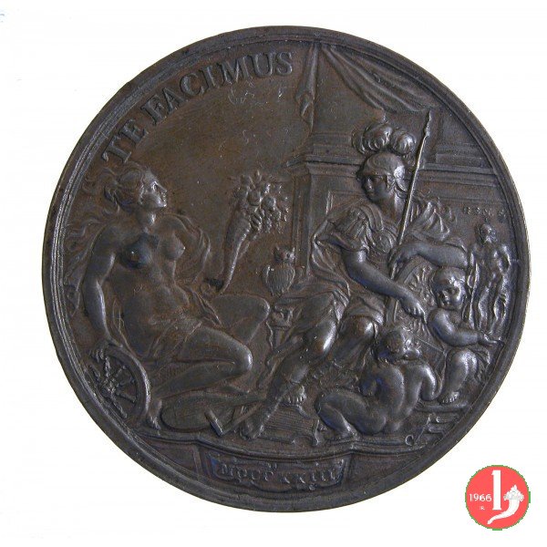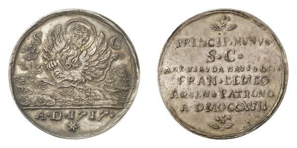 Verso: nel campo tra fregi floreali: PRINCIP • MVNVS = S * C * = ANT • VERVDA • NAVIS OPIF = FRAN • BEMBO= ARSEN * PATRONO = A • D MDCCXVII
