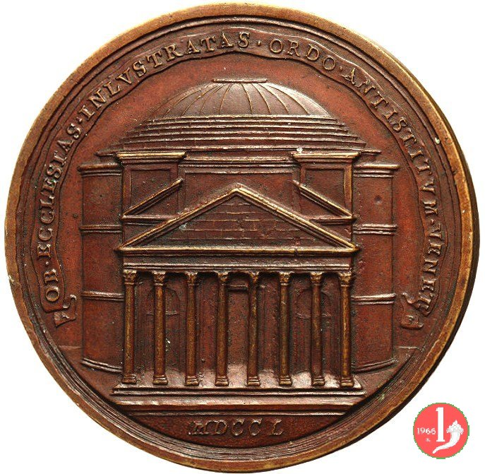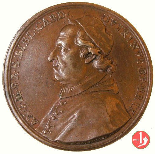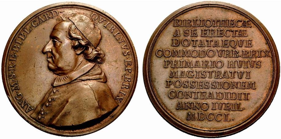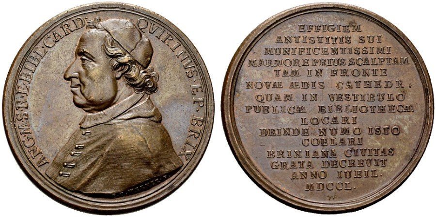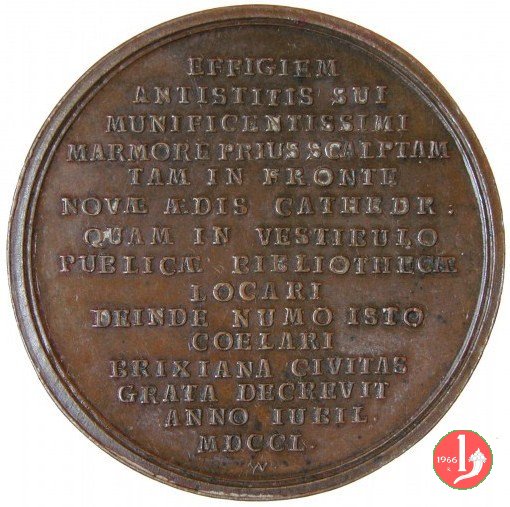 Verso: nel campo su 15 righe: EFFIGIEM = ANTISTITIS SUI = MUNIFICENTISSIMI = MARMORE PRIUS SCALPTAM = TAM IN FRONTE = NOVAE AEDIS CATHEDR. = QUAM IN VESTIBULO = PUBLICAE BIBLIOTHECAE = LOCARI = DEINDE NUMO ISTO = COELARI = BRIXIANA CIVITAS = GRATA DECREVIT = ANNO IUBIL • = MDCCL. = W