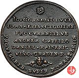 Verso: nel campo: * = IO • CORNELIO DVCE = IOAN • EPIS • CLODIENS = PROCVRANTIBIS = ANDREA CAPELIO = DANIEL * RANERIO = VINC • GRADEN • P • = cherubino